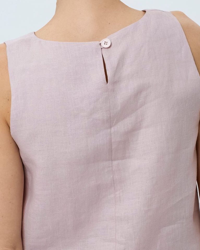 Varrukateta linane top on mõnus igapäevane top, millel on ümara kaelusega lõige, peen nööpkinnitus seljal ning reguleeritav pael allääres. Lihtne ja stiilne valik suvisteks päevadeks.