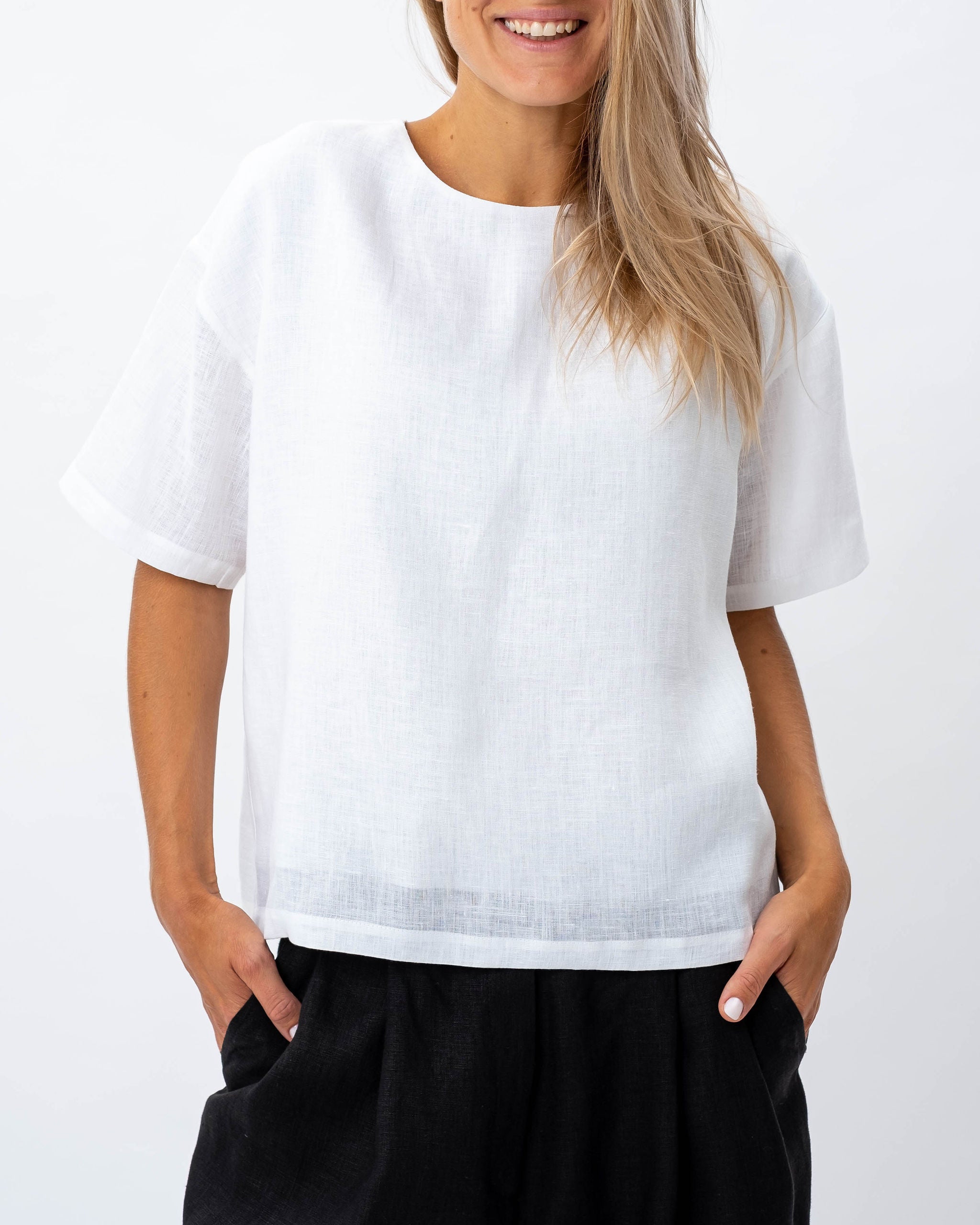 Linane pluus Katie on suurepärane universaalne toode, mida lisada enda riidekappi. Ta on sirge lõikega ning valmistatud pehmendatud linasest kangast, mis teeb ta hingavaks ja mugavaks. Katiel on suurendatud õlad, t-särgi varrukad ja v-kaelus koos paeltega taga. Krae on eest klassikaline ja ta on disainipuhas. Katie on hea täiendus sinu garderoobile, mis sobib lihtsalt erinevatesse keskkondadesse ning annab sulle enesekindluse end alati hästi tunda.
