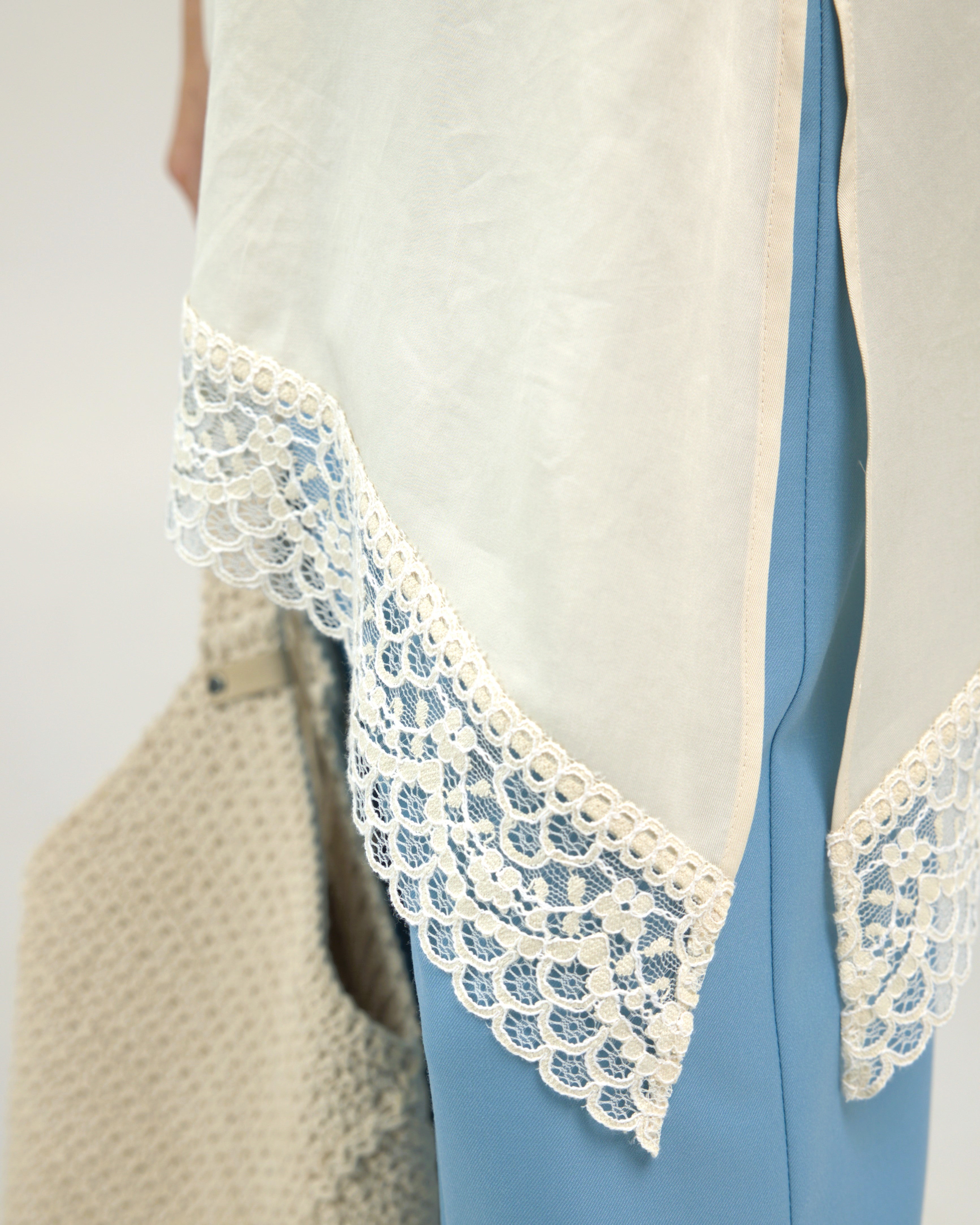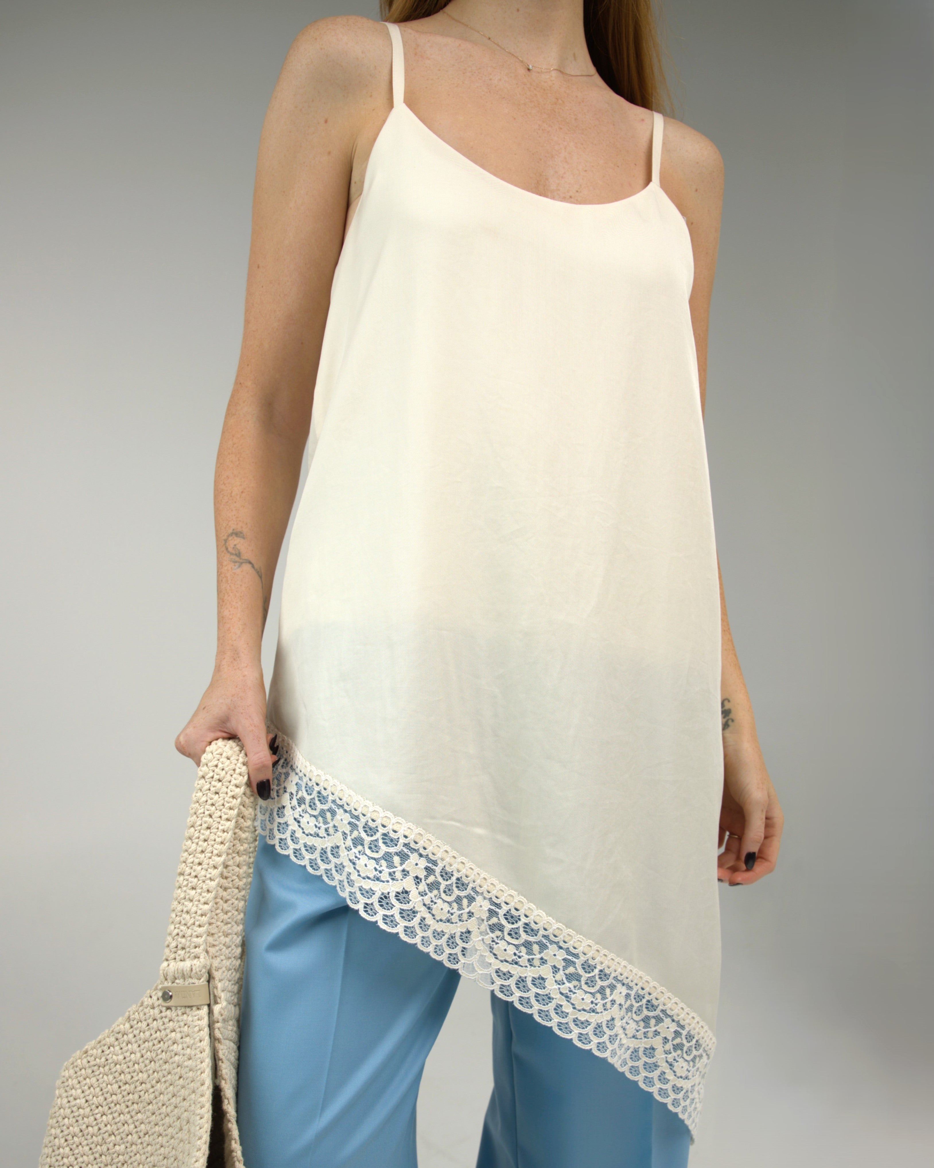 Õhuline Tencel-kangast topp õhukeste paeltega. Asümmeetriline alläär on kaunistatud pitsiga, lisades naiselikku ja elegantset ilmet. Pehme ja hingav materjal tagab mugavuse nii igapäevaselt kui ka pidulikumal puhul.