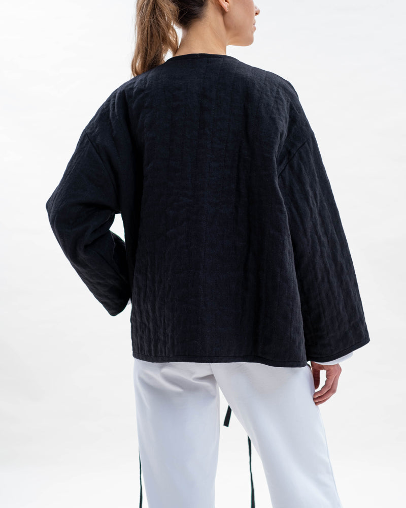 Lina villane jakk on mõnus valik igapäevaseks kasutamiseks. Tal on oversize lõige ning ta on loodud pehmendatud kangast, mis teeb ta hingavaks ja mugavaks. Vooder on naturaalsest viskoosist, mis on naha vastas pehme ja soojendav. Minimalistliku disainiga jakil on kaks küljetaskut ning reguleeritavad paelad, mida saab kinnitada nii seest kui väljast.